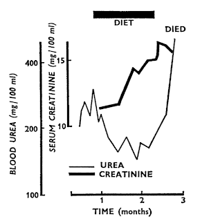 Attempts to simplify the regimen, and make it more acceptable in the Northern Europe of the time by replacing the starch-based spaghetti with bread recipes designed for patients with phenylketonuria, were described by Berlyne and colleagues in Manchester in 1965. Glomerular filtration rates varied from 1 to 5 ml/min. Those with values greater than 2.5 ml/min tended to do better. They reported lowered urea and phosphate and improved (but persistent) acidosis, and perhaps most importantly, reduced anorexia, nausea and vomiting. In a later paper they also described less drowsiness so that patients tended to die in a bleeding-agitation syndrome, which doesn’t sound such a great success. On this diet death occurred when creatinine was over 1800 micromol/l (20 mg/ml), urea a mean of 80 mmol/l (230 mg/dl) (see Figure). Urea:creatinine levels were generally lower on very low protein diets.