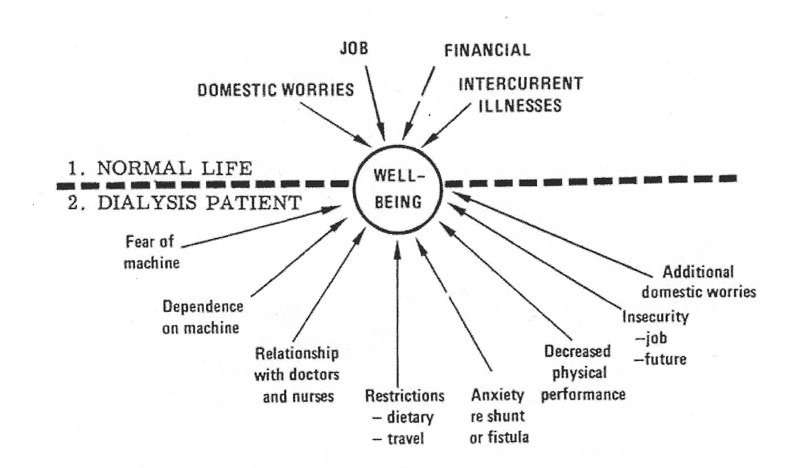 His paper also rather terrifyingly enumerates complications including ‘hard water syndrome’ (Drukker 1968), Cl. welchii septicaemia, brainstem ischaemia following retrograde infusion of saline into the radial artery the start of dialysis, poisoning by formalin from the dialyser, and pyrogenic reactions. These problems ceased when he took over care for his own dialysis with his wife at home. Descriptions of technical and medical aspects are accompanied by a section on well-being (see Figure).