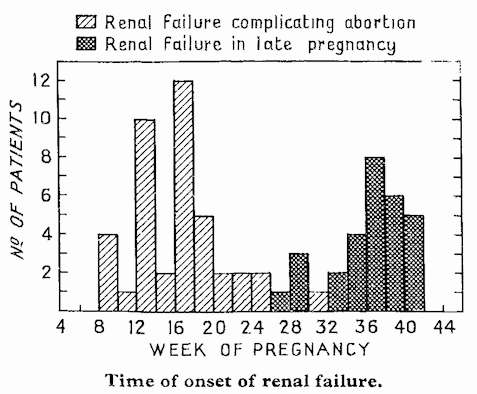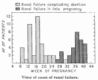 Hammersmith Hospital in West London had a special interest in acute renal failure from the 1940s, and attracted many referrals. In their 1965 report (Kinsey Smith et al) obstetric renal failure accounted for 15% of cases requiring dialysis between 1957 and 1965.  However an estimate from Washington DC 10 years earlier (Schreiner and Berman 1955) was twice as high.