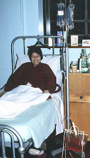 Photo (Copyright reserved): Nora Kehoe with a newly implanted PD catheter, London 1987. It’s the Maxwell system of 1959 with plastic fluid bags.