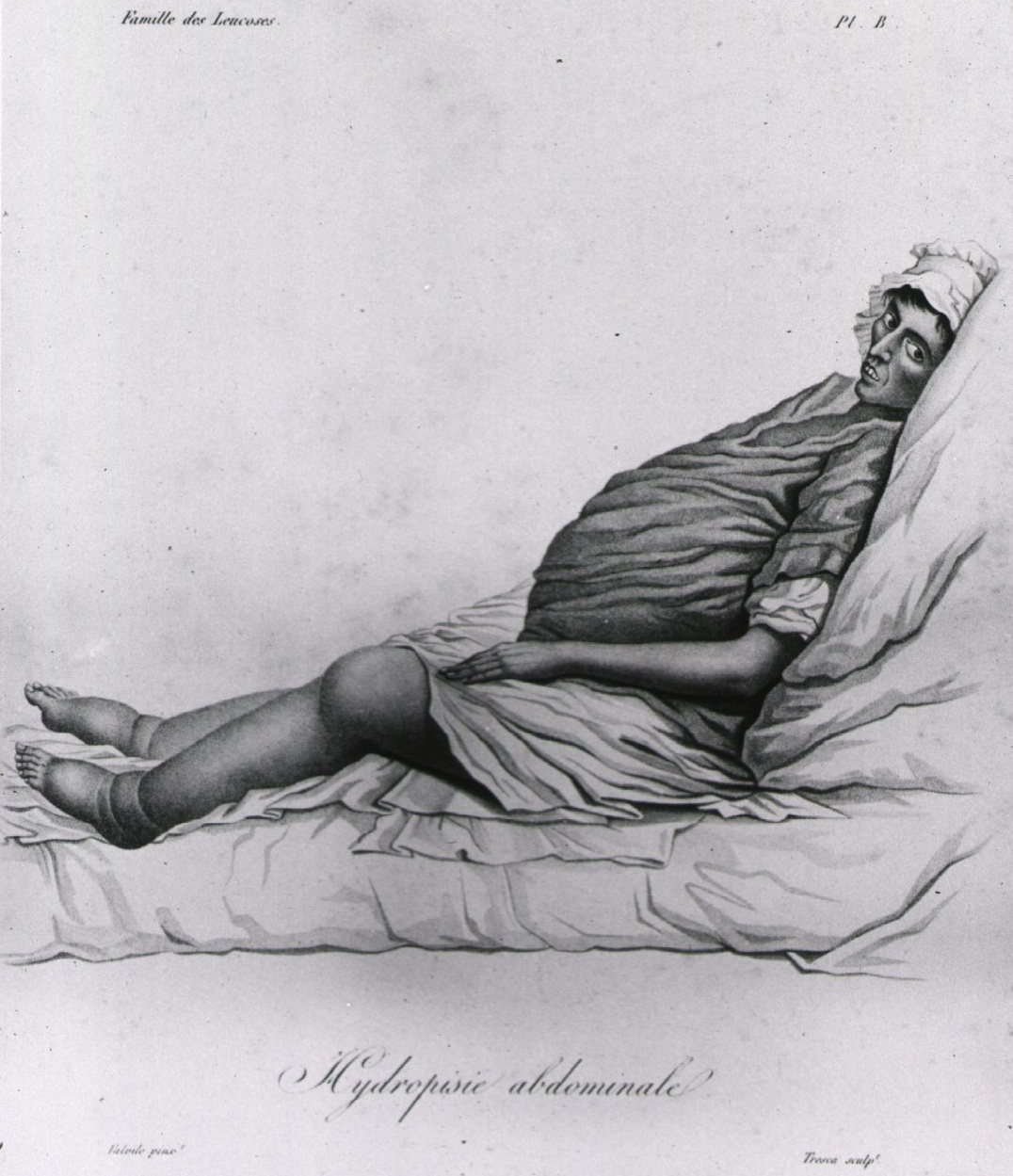 | A woman with dropsy. From Albert JLM; Nosologie naturelle; ou, Les maladies du corps humain distribuees par familles. Paris: Carpelet, 1817. (US National Library of Medicine) |