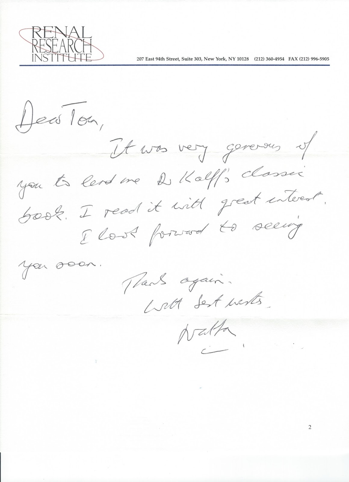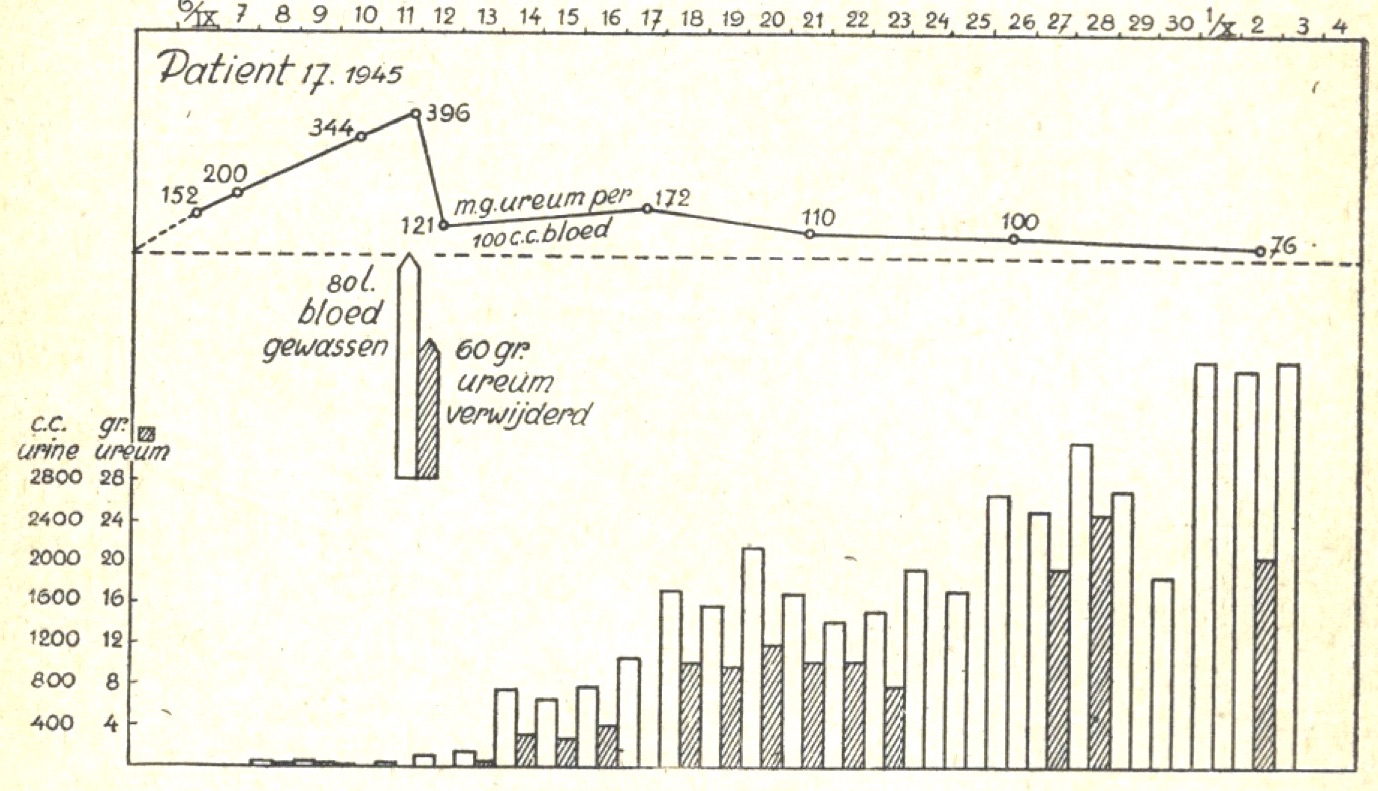 Kolff reported that their own small experience seemed to confirm that maintaining calorie intake could indeed slow down the development of uraemia in an oliguric patient – but that this would not be enough in some cases of acute uraemia. He published their more extended experience 5 years later.