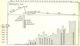Most readers will jump to Chapter 4, in which he recounts his experiences with patients. All were at very advanced stages of uraemia, and almost all died, despite temporary improvements in a good number. Then Patient 17, in September 1945, survived. A 67 year old woman with cholecystitis had been anuric for 8 days, was desperately ill and practically comatose. 80 litres of blood were run through the dialyser over 11.5 hours.